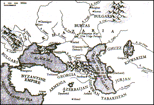 The Khazars' sway extended from the Black Sea to the Caspian, from the Caucasus to the Volga, and they were instrumental in stopping the Muslim onslaught against Byzantium, the eastern jaw of the gigantic pincer movement that in the West swept across northern Africa and into Spain.
