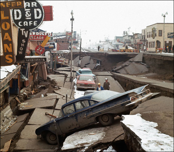 The magnitude 9.2 earthquake that struck Alaska on March 27, 1964 was the second-largest earthquake recorded in modern times (after a 9.5 earthquake in Chile in 1960), and the largest in the written history of North America. It released 100 times as much energy as the 1906 San Francisco earthquake and was followed by tsunamis. During the earthquake, more than 100,000 square miles of Alaska broke, twisted, tilted, dropped and rose.