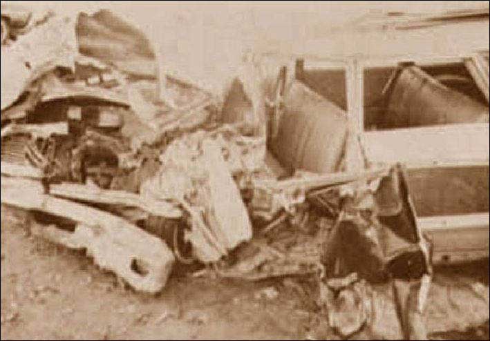 A carload of soldiers, whose drunken seventeen-year-old driver had a history of crime and punishment from the age of eleven, and who had been released from a reformatory only 30 days before, crossed onto the wrong side of the road and was killed instantly. Brother Branham died six days later, on Christmas Eve. This photograph shows the extent of the damage to his 1964 Ford.