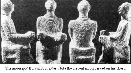 In the 1950's a major temple to the moon-god was excavated at Hazor in Palestine. Two idols of the moon-god were found. Each was a statue of a man sitting upon a throne with a crescent moon carved into his chest (below left). The accompanying inscriptions make it clear that these were idols of the moon-god (below right). The worship tablet found at the same sight (left) shows arms outstretched towards the Moon-god here represented by the full moon within the crescent moon. Several smaller statues were also found which were identified by their inscriptions as the daughters of the moon-god. These are illustrated in the collection of photographs (below).