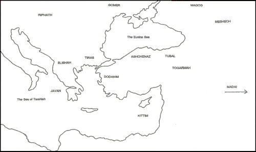 Map 1     The Geological distribution of Japheth's immediate descendents. It should, however, be noted that these given areas of settlement are not necessarily contemporaneous with one another. For example, the area shown for the people of Ashchenez has been deduced from Assyrian documents from the 7th century BC; whereas that of Meschech has been deduced from inscriptions of the 13th century BC. Naturally, a great deal of 'adjustment' would have taken place concerning the borders of each respective nation in that 600 year period, and this must be borne in mind if cetain descrepancies are to be successfully resolved.