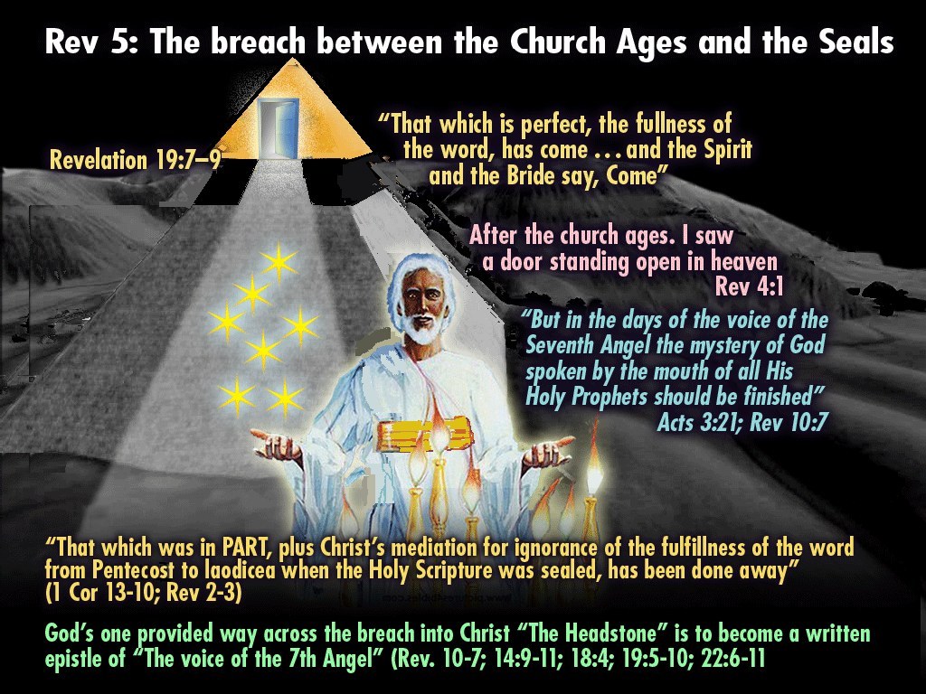 Reading our lesson on the breach between the Church Ages of PART-Word and the Seals or the fullness from God's second Bible, the Great Pyramid, we see there was indeed a breach of faith and divorce resulting in a breach between the body of the pyramid and the head or capping stone. To cross the breach of Revelation 4 and 5 and enter the Caagsone one must possess a clear revelation of the present Truth"—the hidden mysteries of the Voices of the seven thunders under the Seven Seals (Revelation 10:3-4).