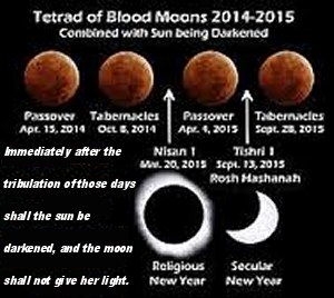 The Sixth Seal will manifest when the Seventh Trumpet sounds the end of the Gentile dispensation and a convulsion of nature shakes not the earth only, but also the heaven. A great earthquake unprecedented in human history will sink Los Angeles and a 1,500 x 300 400 mile segment of earth's crust under the Pacific; the Sun will become black as sackcloth and lunar volcanic activity will turn the full Moon blood red in the middle of the month Nisan. Three days later the first resurrection will commence patterned after the crucifixion and resurrection of Jesus Messiah and the Old Testament saints (Matthew 27:50-53). In 2015 Israel's religious New Year Nisan 1 (March 20) witnessed a total eclipse of the Sun, and "Good" Friday, Nisan 14 (April 4), witnessed a 'blood moon.' There will be a partial eclipse of the Sun for the Feast of Trumpets on Tishri 1 (September 13), marking the start of Israel's civil New Year, while the seventh day of the Feast of Tabernacles on Tishri 15 (September 28) will experience another 'blood Moon'.
