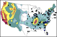 March 18, 2011 Nearly six years before an earthquake ravaged Japan's Fukushima Daiichi nuclear power plant, US regulators came to a sobering realization: seismic risks to nuclear plants in the eastern two-thirds of the country were greater than had been suspected, and engineers might have to rethink reactor designs. What are the risks of an earthquake beneath a reactor near you? This image combines a 2006 map by the United States Geological Survey showing varying seismic hazards across the US with locations of nuclear reactors. Reactors in black are active; reactors in blue are proposed sites for the new model known as the AP1000. Probability of strong shaking increases from very low (white), to moderate (blue, green, and yellow), to high (orange, pink, and red).