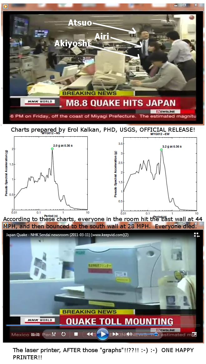 Also, note that most of the stuff stays on the desks, at the end, a laser printer is still sitting on a cheap table, etc., some things fall but things return to normal quickly, all the while the English announcer is reading a script of devastation with all the pep of some paid fool who does not believe what he is saying in a cheezy infomercial. The quake was significant, but only in a 6.0 sense, as recorded by the seismographs. This is important footage, because it proves the earthquake measured at a 6.8 was an instrumentation-based Richter reading. Confusion between the Shindo and Richter scale is being used to cover this up. I chose this video because its location is documented to have been the worst affected, and was recorded in a newsroom with a known fixed location.