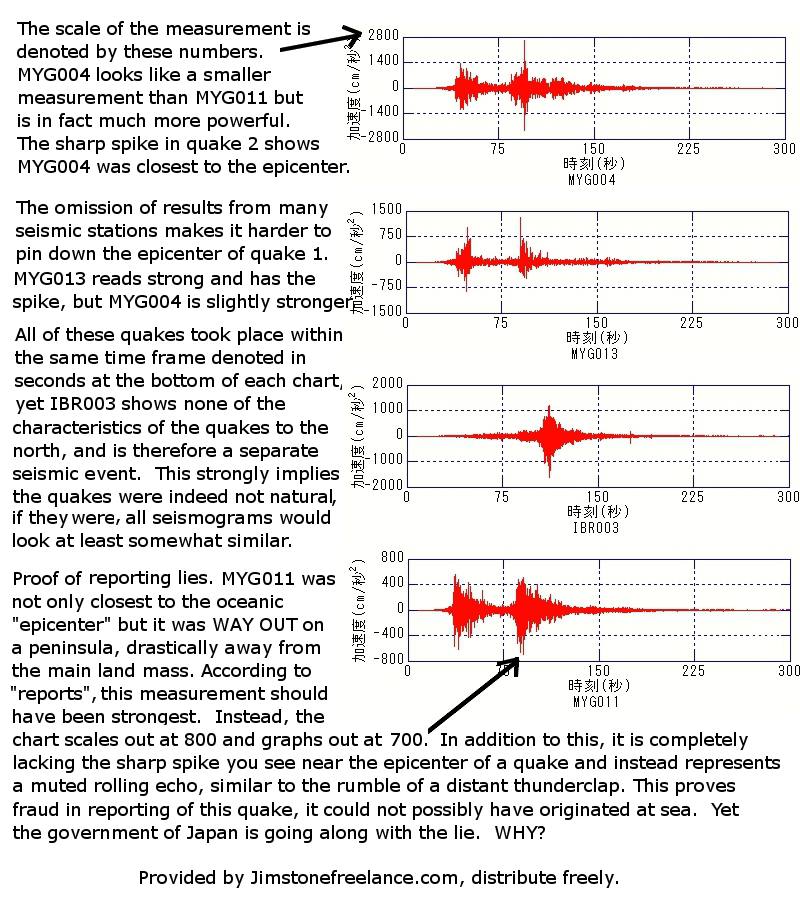 1. I have the real seismic data that proves beyond a doubt the quake is not what we were told and was in fact an inland 6.8, (calculated higher than the seismogram due to the triangulated true epicenter being a little higher), which would be noticed but not feared in quake-ridden Japan.