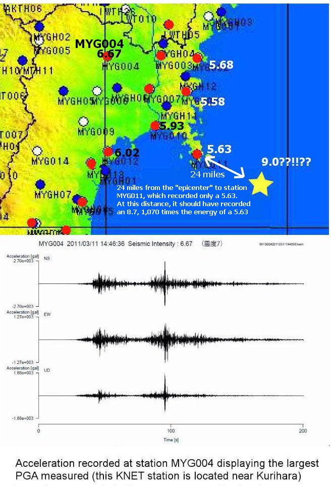 I believe the phony 9.0 story was used as seismic cover for a tsunami nuke, which produced the tsunami of a 9.0 when detonated in the Japan Trench (where no earthquakes of significance happen) as punishment for Japan offering to enrich uranium for Iran. The rest of the story, the concealment, is black ops. Bet on it. In the tsunami videos, the tsunami rips through pristine and undamaged cities, where it is "business as usual," and the tsunami is an ambush; not 9.0 earthquake ravaged debris. The quake is a paper thin story taped together by the undeserved trust of a gullible public. And the stories? The CIA did not hire a million people last year for nothing. If there is evidence of a 9.0 SHOW ME. A 9.0 will devastate an area over 1,000 miles across. That is how big a 9.0 is. The entire nation should be in ruins, especially judging from the damage caused by the 6.9 Kobe quake, and nowhere, nowhere in the entire country outside the tsunami zone is there a single damaged multi-story building, one collapsed bridge, a single structurally damaged timber-framed house, or skyscraper. If a picture exists that can be definitively pinned to this quake, show me. The only collapsed structure in all of Japan was an old welfare shelter near station MYG004, the true epicenter.