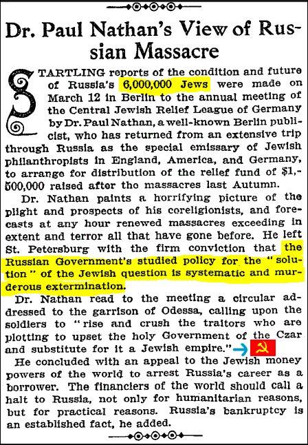 What escaped the 'memory hole' was the fact that Jews conquered and communized Russia in 1917, yet The American Hebrew (October 31, 1919), and The New York Times, Montreal Gazettea and Jewish media around the world continued to promote the extermination of six million Jews by Jew-ruled Judaeo-Communist Russia until at least 1938. The truth is that the victims were not six million imaginary Jews but in excess of sixty-six million murdered Christians.