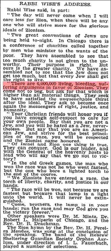 Holocausts of multimillions, even billions of Jews recorded in the Babylonian Talmud as THUS SAITH G_D is the product of the same pathologically lewd degenerate mind that devised the holocaust or extermination of six million imaginary 'Jews' by Germany in World War I, since chucked down the memory hole of George Orwell's "1984," a small chute for censoring and obliterating memory, turning lies into truth and altering the past. In the nineteenth century this sick mind yearned for a holocaust of six million 'Jews' by their innocent target, Tsarist Russia, as recorded in the Encyclopaedia Britannica (10th Ed. (1902) Vol. XXV p. 482), corroborated in The New York Times by Russian immigrant and Chief Rabbi of the United States, Stephen S. Wise on June 11, 1900, and by Jewish publicist Dr. Paul Nathan on March 25, 1906.