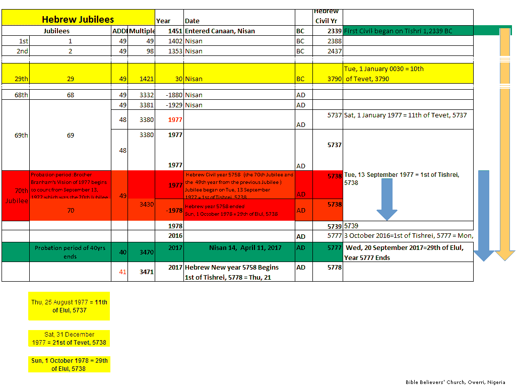 Passover, Nisan 14 this year will be Tuesday April 11, 2017 while the Judaeo-Roman Universal church will celebrate their Good Friday on April 14. I believe as Brother Branham said, "We got seventeen years left until '77 will be the seventieth jubilee since the beginning of jubilees. And what will it be? Oh, brother. Watch close now. Don't miss it. It'll be the Jubilee of the going up of the Gentile Bride and the return of Christ to the